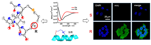Li zigang Group in Peking University Shenzhen Graduate School, pioneered the novel concept of "chirality induced helicity" (CIH) strategy to stabilize polypeptide secondary structure. Studies have shown that, by introducing a precise positioned chiral center in the tether of the stabilized polypeptide, and when the absolute configuration of the chiral center is R can be decisive regulatory polypeptide secondary structure. By studying the two enantiomers of CIH, which have exactly the same amino acid sequence but significantly difference in secondary conformation, they found that increasing polypeptide helicity can significantly enhance the stability of the polypeptide. Further studies showed that for peptides with consensus amino acid sequence, increasing its helicity can significantly increase the cell permeability and target binding affinity. They also found that the newly introduced chiral center substituent groups will interact with the hydrophobic region surrounding the protein binding pocket. This provides a guideline for "fragment-based" polypeptide drug design. The related results was published in the famous magazine