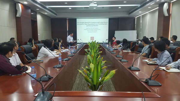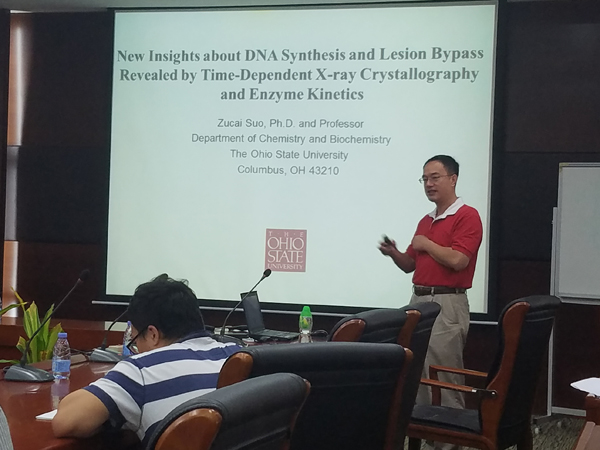 On October 23, 2017, with the invitation of Prof. Wu, Prof. Zucai Suo visited our school and gave a wonderful lecture titled “New Insights about DNA Synthesis and Lesion Bypass Revealed by Time-Dependent X-ray Crystallography and Enzyme Kinetics”.