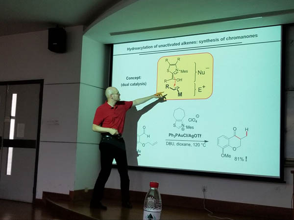 In the report, Prof. Glorius first introduced the wide application of catalysis. As we all know, the expected way to discover a new catalysis is rational design not experimental finding, so the collaborative work of artists and chemists is very important. Then he introduced the development and characteristics of the NHCs and divided the application of the NHCs into three parts:as organic catalyst,in metal complexes,on and in surfaces. NHCs working as organo-catalysts mainly used the special characteristic that when NHCs combined with the aldehydes, polarity umpolung happened. As well as that the structure of NHCs can be chiral,so it can be used for asymmetric catalysis. Many other asymmetric reactions can be achieved with the combination of metal and NHCs. In the second part, he introduced the Ru-NHCs-catalyzed asymmetric arene hydrogenation. The former work in this area focused on hydrogenation of bicyclic N-heterocycles. Before their work, only one homogeneous carbocycle reduction example which is not reactive for substituted compounds was known. Prof. Glorius group switched the phosphines ligands to NHCs and achieved the asymmetric hydrogenation of Quinoxalines. Based on this, they also developed a new catalytic system: chiral NHCs+ metal+ chiral ligand and achieved asymmetric hydrogenation of isocoumarines. In the part of NHCs on and in surfaces, Prof. Glorius introduced how to make an NHC move on the surface to satisfy the mobility required in the self assembled monolayers.