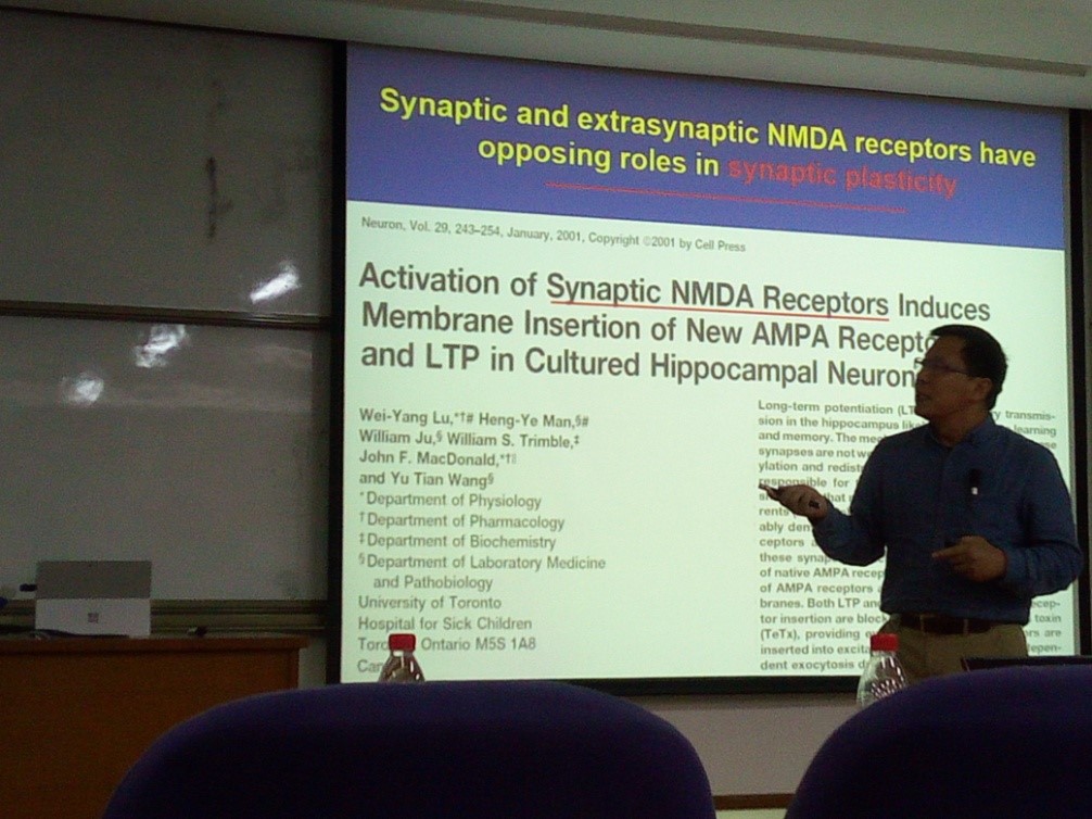 At the beginning of this seminar, professor Wang told us the whole story about NA-1 from discovering to the phase III clinical trials. Taking this opportunity, he introduced the concept of translational medicine to us, and he also told us how fundamental researches enter clinic treatments, of course, the questions and difficulties existing in this process. In this part, he emphasized the findings of NA-1, NA-1 is a peptide (Tat-NR2B9c). Stroke is induced by cerebral hemorrhage or cerebral anoxia, both cerebral hemorrhage or cerebral anoxia can cause cell death. So, how did professor Wang and his team found this drug? As we know, glutamate is a primary excitatory neurotransmitter and responsible for mediating a broad range of nervous system functions through glutamate receptors(NMDAR), there are three functional native NMDARs, includingNR1/2A、NR1/2B and NR1/2A/2B. NR1、 NR2A and NR2B are three type of subunits composing NMDARs. NR2 subunits may differential functions—NR2A and NR2B-containing receptors have opposing roles in synaptic plasticity and cell fates(survival VS death). NR2A locates in the synapse, while NR2B locates in the extrasynapse. Under Normal Circumstances, glutamate will interact with NMDAR in the synapse, and mediate the normal functions of neurons, but during a stroke, when blood and oxygen to the brain are restricted, glial cells lose the function taking up the glutamate in the synapses, so brain cells release glutamate into the space surrounding them, glutamate will interact with NMDARs containing NR2B,PSD95 interacts with both NR2B and nNO, thereby coupling nNO to NR2B,mediating NMDAR-mediated cell death. So according to the sequence of NR2B, professor Wang and his team designed a peptide named Tat-NR2B9c, Tat-NR2B9c interferes the interactions between NR2B and PSD95, thereby disrupting the NR2B-nNOS coupling and preventing NO-mediated neuronal death. According to the properties of Tat-NR2B9c, professor Wang’s team set up a company themselves to design clinical trials. NA-1 had already finished phase I and phase II clinical trials, and they had proved that NA-1 is effective as a stroke treatment.