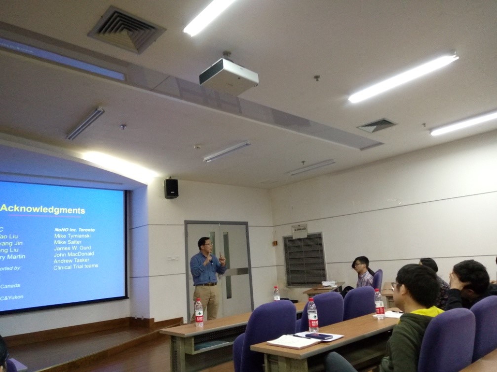 On March 6, 2017,professor Qiang Zhou and Shupeng Li invited professor Yu Tian Wang who is from University of British Columbia to visit our school, In the morning hours the day, professor Wang gave his report named“Bench to Bed Translational Medicine Research—Can we cross the Death of Valley? ”to us. He combined with the research works of their own to show us how research results transfer from bench to bed, and the questions and difficulties existing in this process. In the meantime, he also talked about some interesting research works they had done, all the teachers and students were attracted by professor Wang’s topic, and they raised a lot of questions at the same time. In a word, this seminar enhanced our mutual understanding and friendship via ardent communication with professor Wang.