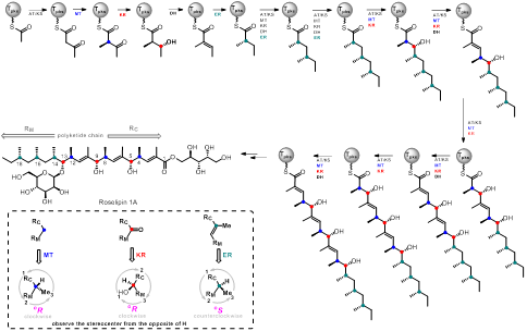 天然产物因具有结构及生物活性的多样性,在新药和先导化合物的开发中起着重要作用。准确无误地确定天然产物的分子组成信息及其三维空间立体信息则是其中关键一环。现代用于天然产物结构确定的主要技术包括:核磁共振技术、高分辨质谱分析技术及X-射线晶体衍射技术等。尽管这些方法极为强大,但是在确定具有复杂骨架和多手性中心的天然产物时也需要复杂繁琐的解析过程和足够的样本量,并且时有鉴定结果和实际存在误差的情况发生。为了确定通过这些解析技术得到的天然产物立体结构信息的准确性,通过全合成手段合成目标构型的样品并与天然分离的样品进行表征数据的比对仍是确定天然产物立体结构最准确可靠的方法之一。然而对于含有多个未知手性中心的天然产物来说,通过全合成手段来合成所有潜在的异构体并与天然产物的表征数据进行比对是耗时耗力的,而可靠的结构预测规则可以帮助合成化学家排除一些潜在的异构体从而缩小范围。Roselipins是由2015年诺贝尔生理学或医学奖获得者Ōmura的课题组于1999年从海洋真菌Gliocladium roseum KF-1040的培养液中提取到的一类糖脂类天然产物,该课题组确定了该家族所有分子的二维平面结构,均由一个聚酮单元和两个糖基单元组成,其中聚酮单元的9个手性中心的相对、绝对立体化学并没有得到确定,以该家族的roselipin 1A为例,其潜在的异构体数量高达512种。