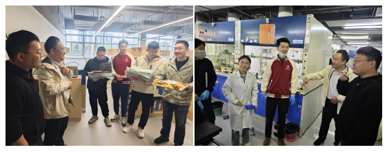 2025年1月14日上午,威廉体育williamhill执行经理李子刚,副经理彭涛,学工办老师李健、鹿亚男等带着精心准备的慰问品、公司新年贺信等物资,逐一走访了公司内的多个实验室。每到一处,领导们都与师生们亲切交谈,详细询问大家的工作、学习和生活情况,对大家在过去一年中取得的科研成果和成绩表示充分肯定和高度赞扬。