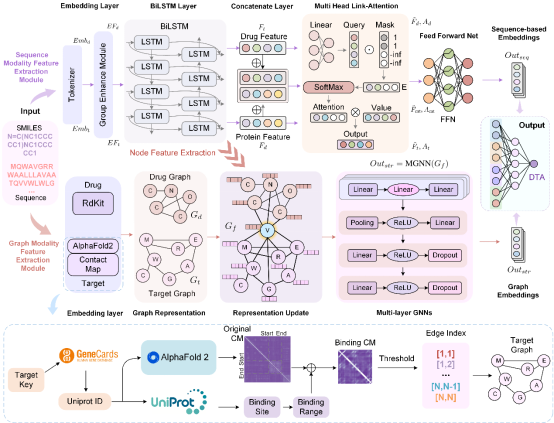 准确预测药物与靶点之间的结合亲和力是药物研发中的关键步骤,但传统的实验方法耗时长且成本高昂。尽管人工智能技术在该领域取得了显著进展,但现有的计算方法往往难以同时利用药物和蛋白质的序列与结构信息,且在处理药物分子与蛋白质的尺度差异时存在挑战。针对这些关键难题,作者设计了DMFF-DTA,这是一种基于双模态神经网络的药物靶点亲和力预测模型。DMFF-DTA创新性地整合了序列模态特征提取模块和图模态特征提取模块,通过序列和图结构两个维度对药物和靶点进行建模。此外,为了解决药物和蛋白质图之间的尺寸不平衡问题,模型引入了基于AlphaFold2的结合位点接触图构建方法。
