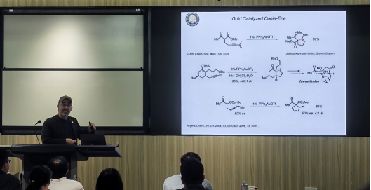 Toste教授的报告重点介绍了他研发的金属金催化的多种炔烃、烯烃的反应,包括卡宾中间体参与的成环反应与双环化反应,金属金离子与pi-型分子配位的基础研究、催化成键机理研究,以及此类反应在复杂分子合成中广泛的应用。