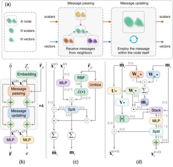 为解决上述难题,研究团队提出了一种兼具精度与效率的等变图神经网络(E2GNN)。与传统等变模型依赖复杂高阶张量表示不同,E2GNN 采用简洁的“标量-向量”混合表示编码等变特征,并引入全局消息传递机制,以精确捕捉长程原子相互作用,从而实现高精度、高效率的势能预测。全局消息传递与门控消息传递机制的协同,又进一步提升了模型整体表现。