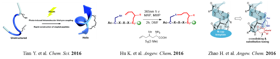 6. Tian, Y.; Li, J. X.; Zhao, H.; Zeng, X. Z.; Wang, D. Y.; Liu, Q. S.; Niu, X. G.; Huang, X. H.; Xu, N. H.; Li, Z. “Stapling of unprotected helical peptides via photoinduced intramolecular thiol-yne hydrothiolation” Chemical Science 2016, 7, 3325.