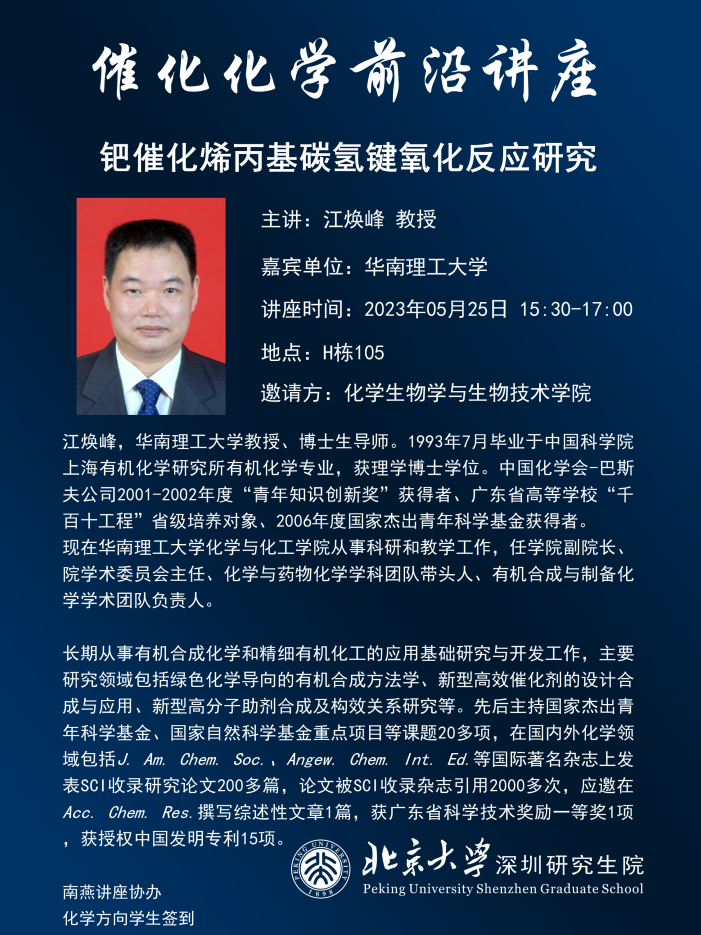 大家好,2023年05月25日(星期四),威廉体育williamhill邀请了华南理工大学的江焕峰教授到访公司,并作题为《钯催化烯丙基碳氢键氧化反应研究》的学术报告,欢迎大家参加!