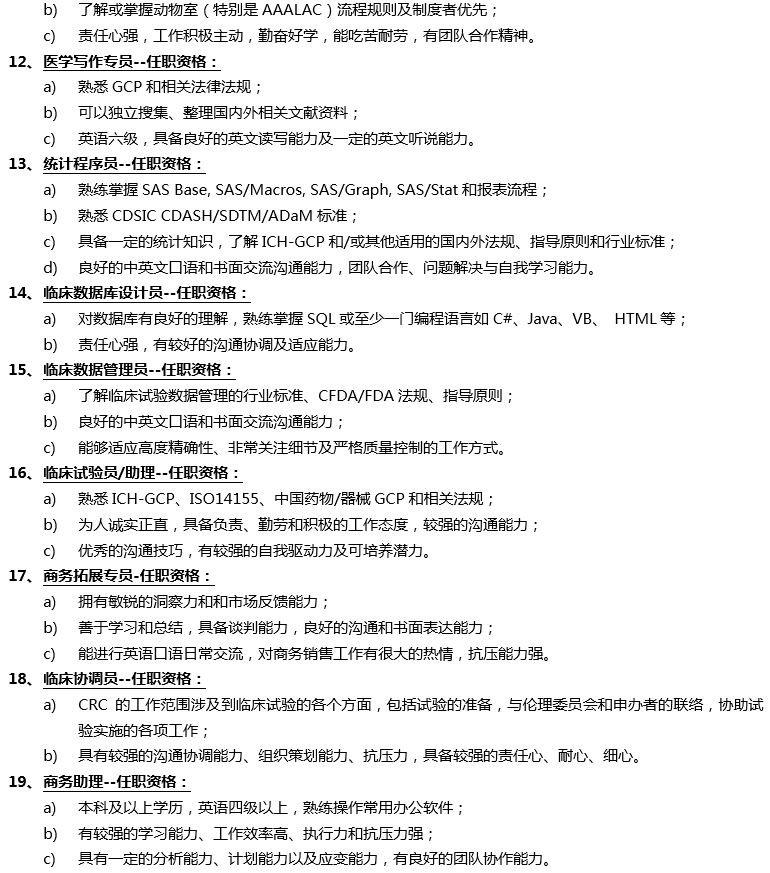 4、 完善的职业发展规划: 随着工作经验的积累,可以向人员管理/项目管理/质量管理/培训岗挑战。人员管理岗 CRC-SCRC(高级)-TL(组 长)-省级区域经理-高级区域经理;项目管理岗CRC-PL-APM-PM;质量管理岗QA QC;培训岗为企业内训师