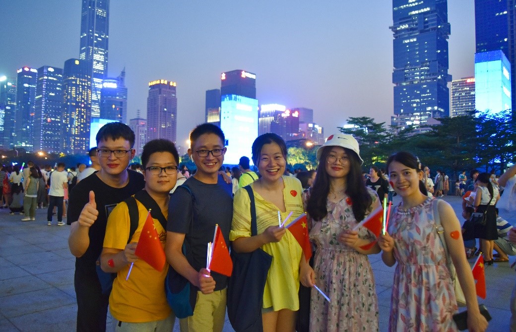 晚7时,同学们步行来到市民中心观看70周年国庆特别版灯光秀。这款光影盛宴不仅在微博、朋友圈等社交媒体走红,现场更是人山人海。同学们的脸颊上、手臂上贴着心形的国旗贴纸,手上挥舞着荧光棒,迫不及待地望向耸入云天的摩天大楼。当清亮的 “我和我的祖国,一刻也不能分割”歌声响起,全场沸腾,满眼满心都被中国红萦绕,大家纷纷拿起手机拍摄楼宇上流动的五星红旗,生怕错过记录感动的瞬间。在灯光秀表演的短短19分钟里,同学们不仅饱揽了祖国大好河山,体验了璀璨的中华文明,更流溢出强烈的民族认同感。美轮美奂的灯光秀好似祖国绚烂般崛起的回放,70年的波澜壮阔,70年的披荆斩棘浮现眼前。站在改革开放的热土上,沐浴着新时代的浩荡春风,作为新时代青年,唯有奋进铸就复兴伟业。最后,“建设中国特色社会主义先行示范区”十五个鎏金大字映入眼帘,描绘出湾区明珠深圳的美好前景。