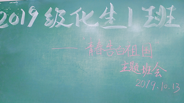 2019年10月13日,为庆祝中华人民共和国成立70周年,回顾共和国建设发展历程,带领同学们做到知史爱党、知史爱国,公司2019级化生1班(北京班)在班长郭小春、党支书张钊祥的带领下,举行了“青春告白祖国”主题班会。