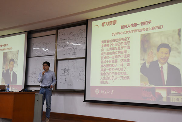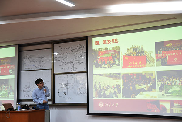 班会伊始,班长陆正昌、吴博华、谈心妤等3人带领同学学习校纪校规。陆正昌以“翟天临事件”、“北大马克思主义协会改组事件”、“威廉体育williamhill三瓶可乐事件”为切入点,分别从学术道德,政治信仰,行为道德规范层面让同学们理解“扣好人生第一粒扣子”对于学习生活的重要性,引导同学对三个案例进行深入探讨,其间穿插校纪校规知识竞答。该部分学习最后,为了促进班级同学遵守校纪校规、促进班级同学团结向上,班委会提出了促进班级团结向上的已经实施的和拟实施的若干措施。