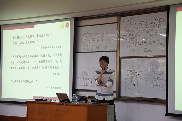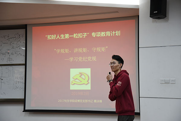 紧接着,党支书蔡泳锋、郑行等2人带领同学学习党纪党规。蔡泳锋的讲解以“学规矩、讲规矩、守规矩”为主线,简要介绍了党纪党规包含哪些文件,重点介绍了《中国共产党章程》、《关于新形势下党内政治生活的若干准则》的重点内容,并鼓励同学们提升自己的政治素养、积极申请入党。郑行结合电视剧《人民的名义》中刘新建和孙连城的形象,以短视频的方式宣讲共产党人“真信”和“真做”这基本的规矩。