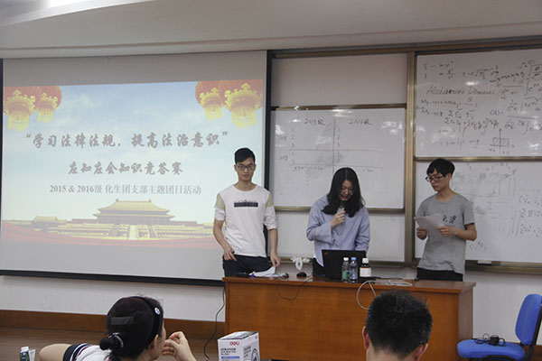 之后,团支部的罗贞、董磊、谢栩杰三位同学负责法律法规的宣传教育,并进行了“学习法律法规,提高法治意识”的应知应会知识竞答赛,2015级与2016级研究生班的代表队展开了激烈的角逐,在经过了个人必答题、小组必答题和抢答题后,最终2015级代表队获得了比赛胜利,赢得了丰厚的纪念奖品。