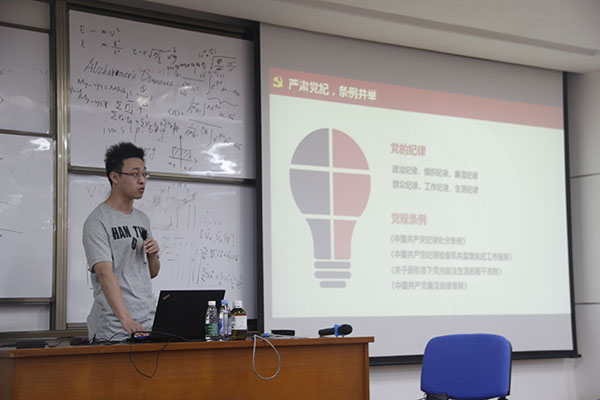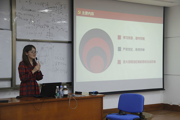 主题班会伊始,支部党委组织同学学习党规党纪,赵志英同学介绍了中国共产党章程的发展历程,详细讲述十九大党章修改的主要内容。王天宇同学介绍党纪相关内容,包括中国共产党纪律处分条例、新形势下党内政治生活的若干准则等,并播放“秦岭别墅违建始末”视频来生动反映重大违规违纪案导致的恶劣社会影响。