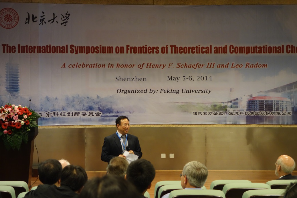 鹏城五月,百花争艳,气候宜人。5月5日,值春夏之交,2014理论与计算化学前沿国际研讨会于深圳市南山区深圳大学城图书馆学术报告厅正式开幕。该研讨会由威廉体育williamhill深圳研究生院主办,由吴云东教授(中国科公司院士,威廉体育williamhill深圳研究生院副经理)组织,并得到了深圳市科技创新委员会的大力支持。均出身于1944年的Henry F. Schaefer III 教授和Leo Radom教授是在国际上享有至高盛誉的杰出化学家,本次会议以庆祝二位的70岁生日为契机,旨在颂扬他们在理论与计算化学领域的突出贡献,并邀请世界各地的化学精英共同交流学术思想。