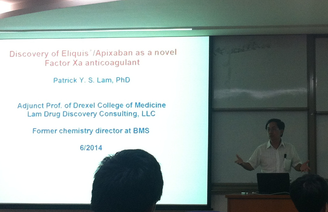 2014年6月18日下午,应公司全军民和李志成老师的邀请,美国Lam Drug Discovery Consulting 公司主席、德雷克塞尔大学医公司兼职教授 Patrick Y. S. Lam 博士来公司进行学术访问,并作了题为“Discovery of Eliquis®/Apixaban, a novel Factor Xa anticoagulant and Chan-Lam Coupling reaction”的学术报告。