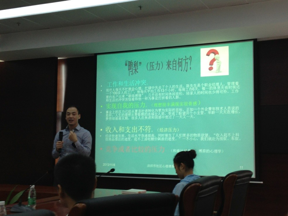 2013年11月8日,受公司李子刚教授的邀请,福田区沙头街道“阳光心灵”工作室专职国家心理咨询师王留峰先生以及国家二级心理咨询师黄琳琳女士来公司开展心理讲座。