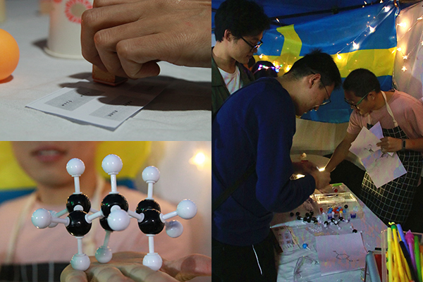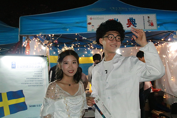 公司的瑞典之旅更是别具一番特色,身披白纱的露西亚女神优雅而动人在镜湖旁的降临为成为了一道亮丽的风景线,而睿智的诺贝尔先生也举起诺贝尔的奖牌将智慧的光芒洒满镜湖旁。在充满北欧风情的白色小屋中,公司的同学用识别各国国旗、构建分子模型等一个个精彩的游戏组成了别具风味的北欧之行,让来自其它公司的同学在娱乐中体会到诺贝尔奖获得者对科学奥秘的不懈钻研,感受到瑞典这个冰雪国家的风土人情。当然,最具的特色的当属在当晚七点半点开启的鲱鱼罐头了,对未知的好奇驱使着各位“旅客”亲口品尝鲱鱼肉,使大家不仅收获了有趣的知识,也在欢呼声中品尝到了闻名已久的味道。