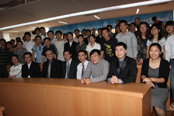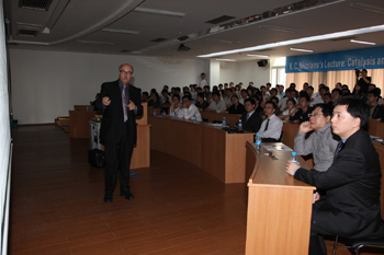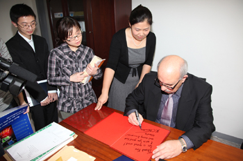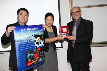 在报告会上,Prof. K. C. Nicolaou 用精采的演讲把大家带入到广阔的有机全合成化学的世界当中,详细讲解了催化和串联反应在全合成中的作用,向大家展示了有机全合成化学在当前科学界的重要地位和无穷魅力。在互动提问阶段,同学们争相利用这个难得的机会向大师求教,从尖端的科研问题、巧妙的反应设计、前沿的学术探讨到大师对待人生的态度,大师的一切都是同学们感兴趣的话题。Prof. K. C. Nicolaou 也没有让同学们失望,每一个问题他都认真作答,还用幽默风趣的比喻解释了他是如何选取合成对象这一问题的,在回答“什么让您觉得最骄傲?”的问题时,Prof. K. C. Nicolaou 肯定地说“这个问题很简单,当然是我的员工们”,大师的回答引发了全场热烈的掌声,也将报告会的气氛推入高潮。会后大家争相向大师索取签名,合影留念。随后Prof. K. C. Nicolaou 还饶有兴致地参观了化学基因组学重点实验室,并题名留念。