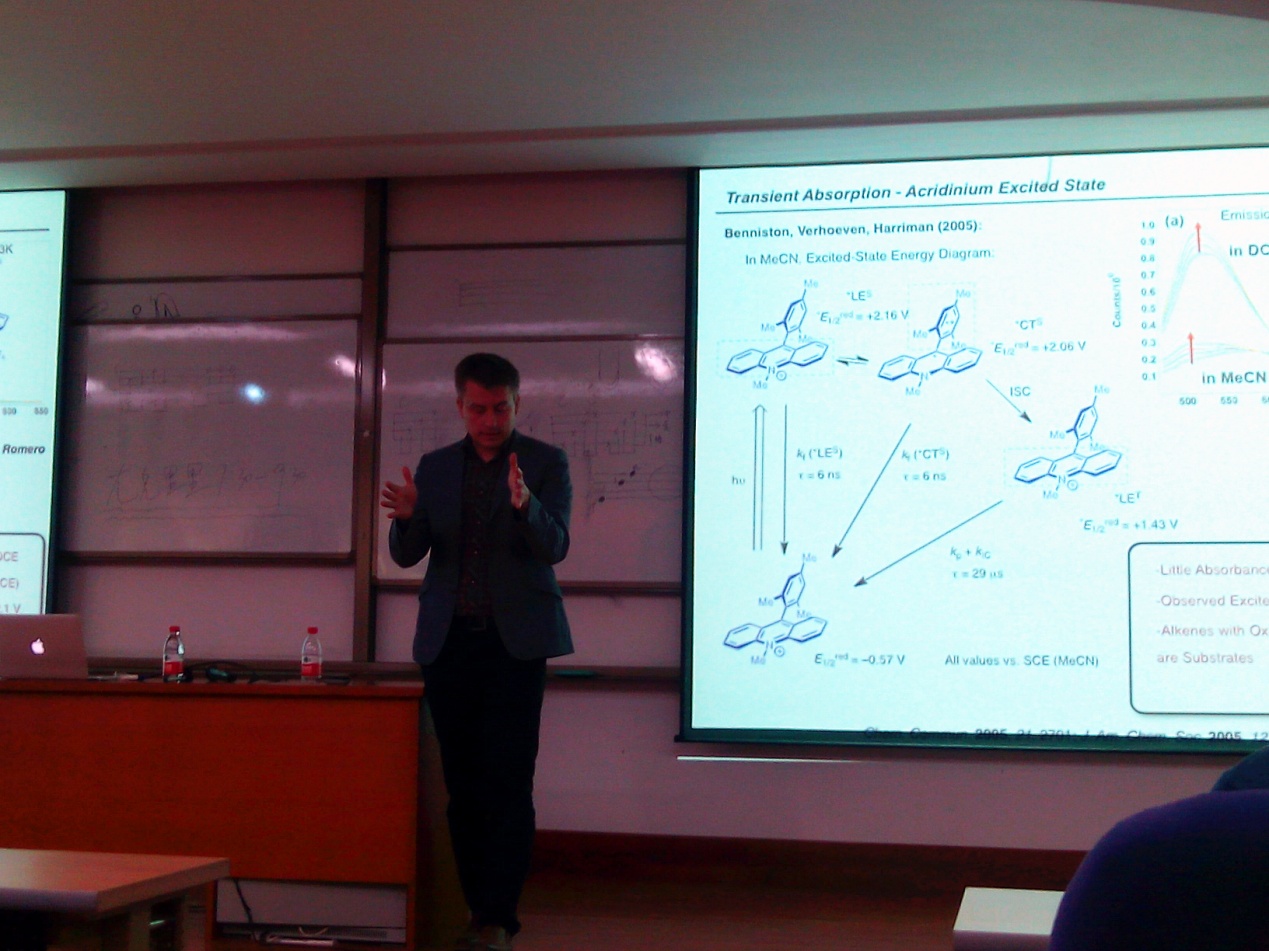 4月7日,应公司黄湧教授的邀请,来自北卡罗来纳州大学教堂山分校(University of North Carolina at Chapel Hill)David Nicewicz到公司进行学术交流,并在E-104带来了题为《New Avenues in Synthesis via Organic Photoredox Catalysis》的精彩学术报告。David Nicewicz教授利用有机光催化剂,通过单电子转移过程,先使烯烃产生碳正自由基,然后接受含氧,含氮亲核试剂的进攻,马氏和反马氏的比例是由新生成的碳自由基的稳定性所决定,最终的产物为反马氏产物。报告结束后,David Nicewicz教授与公司师生就有机光催化化学进行热烈的交流和讨论。