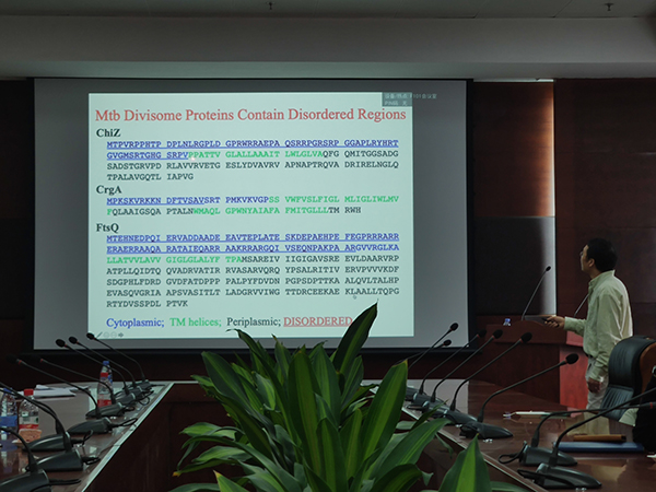 内无序蛋白是蛋白质组学的重要组成部分,它是许多细胞功能的中心,但是对内无序蛋白如何编码其构象集成、构象动力学以及行使的功能这些问题科学家们还了解有限。周教授先以ChiZ(结核分枝细胞分裂机制的一个组成部分)这个膜蛋白为例,使用固态核磁共振揭示N端无序区域的两半之间存在不同的动态偏好;同时以分子动力学模拟的结果解释了这种差异。又以synaptotagmin-1(突触结合蛋白)这个含有内无序区域的膜蛋白为例,介绍了synaptotagmin-1以一个无序区域的相互作用,从而使C2B区域从囊泡膜脱离并向质膜方向结合,从而有可能促进下一步的囊泡和质膜融合。