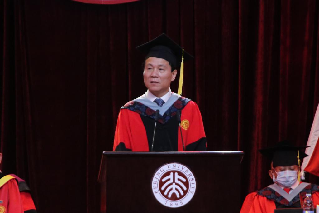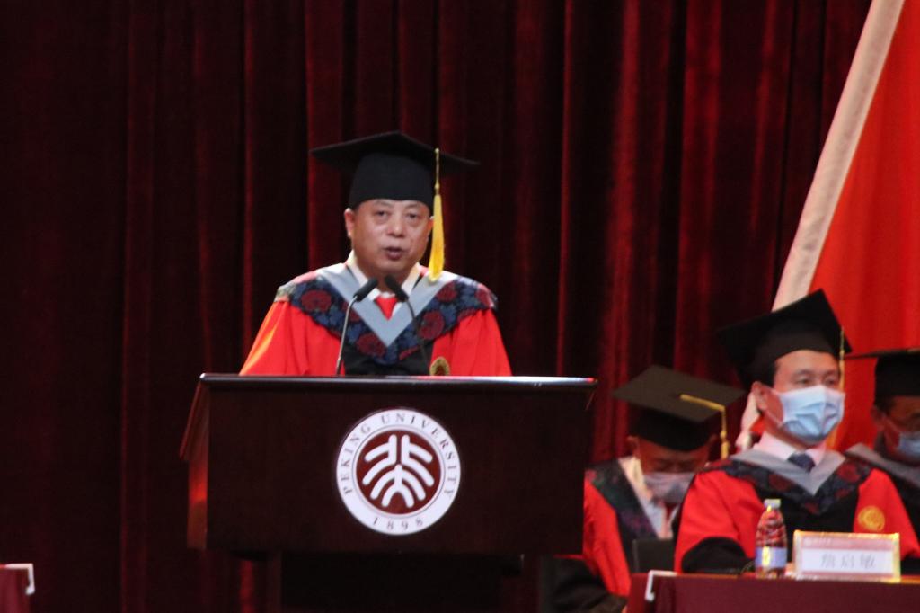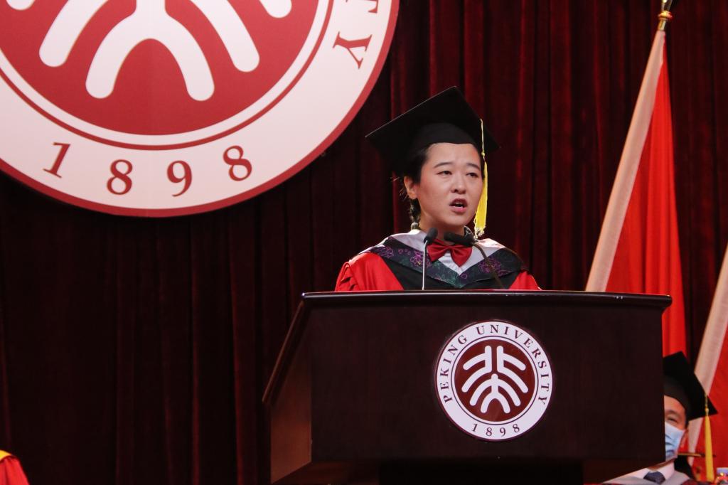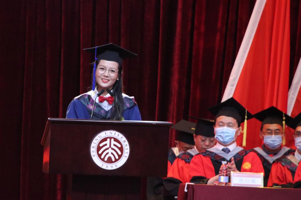 首先,信息工程公司李子璇同学代表全体毕业生发言。李子璇同学从和导师第一次见面的对话,谈到科研中的心得体会,她说,自己在求学路上遇到的困难和挑战,正是北大前辈们曾经走过的漫漫长路。“让我们像无数前辈们一样,做一颗发光的小星星,用自己微弱的光芒照亮世界,为国家科技进步和民族复兴贡献自己的一份力量。”