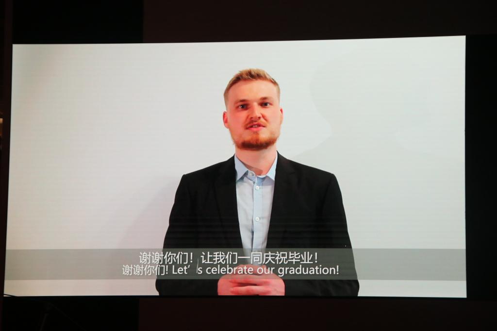 接下来,职工代表——来自汇丰商公司的Philipp Hackel同学以视频的形式发言。他说,自己在南燕的收获可以归结为两点,一是多元的文化使自己视野的大大提升,二是北大严格的学术标准使自己学有所成。南燕三年,不虚此行。
