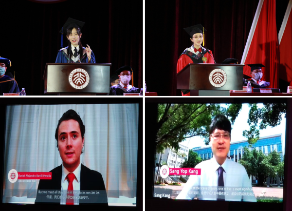 毕业生代表,身在墨西哥的汇丰商公司员工Daniel Alejandro Bonfil Penella在线上发言。他分享了自己来到深研院学习的收获:在这里学习是一个打破陈规的过程,这里全新的生活让他明白了亲身经历和拥抱差异的重要意义;南燕丰富多彩的回忆组成了属于他的关于成长的故事;而中国的发展也让他看到,伟大的改变具有可能。最后他对全体毕业生表示祝贺,并用中文说道“衷心地感谢中国,衷心地感谢北大”。