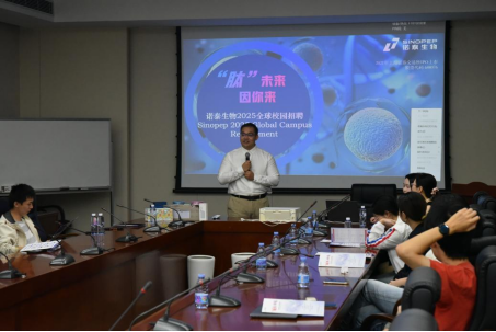 宣讲开始,诺泰生物的主任研究员张博士首先向在场的师生们详细介绍公司的基本情况、发展历程、全球布局以及科研实力。通过介绍公司三大技术平台以及展示公司的明星产品,如司美格鲁肽和奥司他韦等产品,充分体现诺泰生物在多肽、小分子和寡核苷酸药物研发领域的最新成果和前沿技术。这些成果不仅体现了诺泰生物在医药领域的领先地位,也与同学们的专业密切相关,激发了大家的关注与兴趣。另外,张博士还给同学们提出宝贵的意见,希望大家重视毕业后的第一份职业选择,诺泰生物作为一家快速成长期的企业,也将为各位同学提供更好的职业起点。