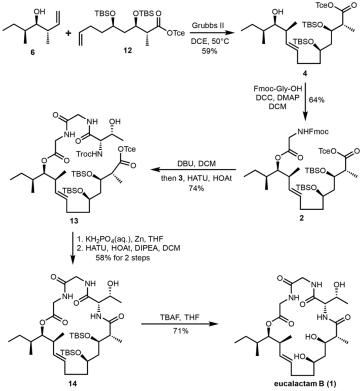 随后化合物12可与已知片段6发生CM反应得到聚酮链4。随后,通过与Fmoc-甘氨酸发生Steglich酯化得到化合物2。2在DBU条件下与二肽3进行一锅法接肽得到关环前体13。13在锌粉和弱酸性条件下同时脱保护后在HATU催化下进行大环内酰胺化得到化合物14,再脱除硅保护基得到化合物1。经核磁、质谱、旋光等数据比对,化合物1的表征数据与天然产物eucalactam B 的数据高度吻合,证明了前文提及的生源合成规则在真菌源聚酮类天然产物结构预测中的正确性。