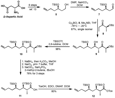 该团队首先聚焦聚酮链右侧片段的合成。起始片段5可通过D-天冬氨酸由6步已知反应获得。经Dess-Martin氧化成醛后与已知化合物8发生Paterson Aldol反应得到单一异构体9。9经TBS保护得到化合物10后经一锅法还原-醇解、氧化裂解和Pinnick氧化后得到羧酸11,再经过Tce保护后得到右侧片段12。