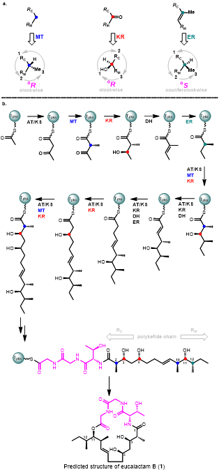 图2. a) 对oR 和 oS立体构型的定义 b) 基于生源合成规则对eucalactam B 构型的预测。 图例:AT:酰基转移酶;MT:甲基转移酶;KR:羰基还原酶;ER:烯酮还原酶;KS:羰基合成酶;DH:脱水酶