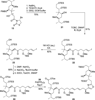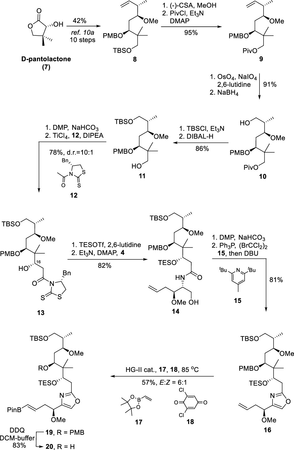 首先是硼酸酯20和烯基碘24的合成,它们都可以从中间体13转化而来。从易得的原料7出发,在作者原有的研究基础上,经过10步转化得到中间体8,经过常规官能团转化以及Nagao aldol反应,得到中间体13。后者经过Wipf改良的Robinson−Gabriel噁唑环化反应、烯烃复分解反应得到硼酸酯化合物20。