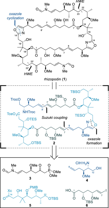 由于其显著的生物活性和独特的分子结构,rhizopodin得到合成界的广泛关注。2011年,Nicolaou首次完成了19元环单体rhizopodin的全合成,同时发现该单体化合物并不具有活性。2012年,Menche报道了基于Suzuki大环化合成策略的首次rhizopodin全合成。2013年,Paterson报道了基于Yamaguchi酯化构建大内酯化策略的rhizopodin全合成。基于前期研究结果,作者另辟蹊径,提出新的合成策略:选取噁唑环为关环位点,通过HWE (Horner–Wadsworth–Emmons)反应引入不稳定的trans-N-乙烯基甲酰胺结构单元。而关键底物2可以通过Suzuki偶联,Yamaguchi酯化等关键反应实现,这样rhizopodin可以从片段3、4、5、6转化而来。