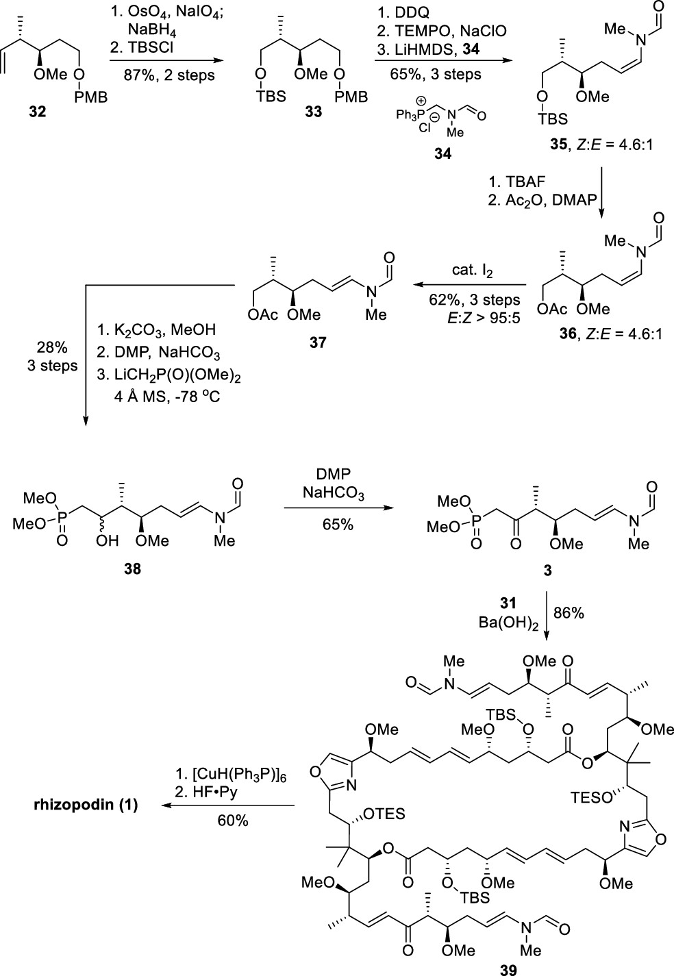 接着是引入含有不稳定的trans-N-乙烯基甲酰胺结构单元。在Menche的全合成中,虽然也是在C22-C23位利用HWE/Stryker还原的方式引入,但是所用的磷酸酯片段并不包含敏感的N-乙烯基甲酰胺单元,所以其全合成后期需要额外2步转化才能得到完整的边链结构。为此,作者尝试先期引入trans-N-乙烯基甲酰胺结构单元。在Paterson工作的启发下,从已知化合物32出发,经过常规官能团转化,得到Z式占主要构型的产物35,后者在避光、催化碘作用下能单一的转化为E式主要产物,但是产率低、重复性差,无法大量备料。故将TBS换为Ac保护基,底物36在避光、催化碘作用下转化为单一的底物37。经过脱保护、氧化、亲核加成,氧化后得到关键磷酸酯片段3。后者与醛31在Ba(OH)2条件下发生HWE反应,得到双官能团化的高级中间体39,最后经过Stryker还原和脱保护实现了rhizopodin的全合成研究。