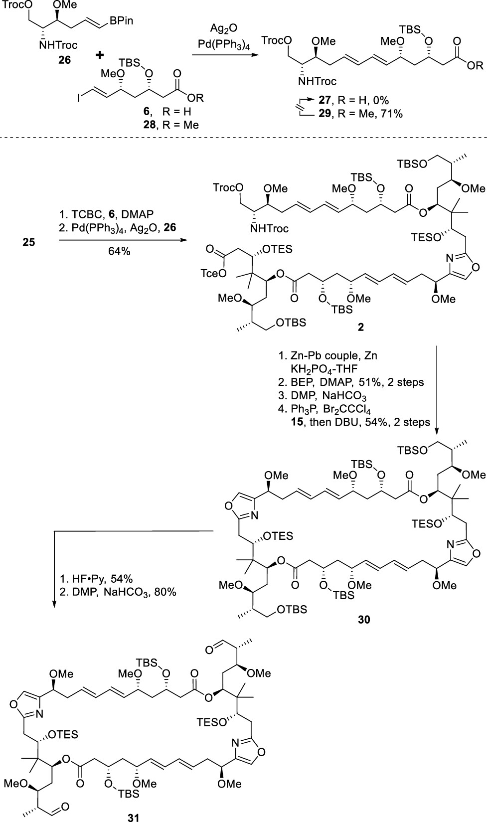 作者计划将底物25与酸27进一步发生Yamaguchi酯化以得到片段2。但是经过尝试发现,底物26与酸6不能直接发生Suzuki偶联反应获得27,即使顺利得到甲酯化合物29,也未能顺利将其水解为酸27。故作者只能先接酯键后Suzuki偶联的方式制备化合物2。随后在锌-铅合金作用下脱除Troc和Tce保护基,在BEP偶联实际作用下关酰胺大环,将一级羟基氧化到醛后,利用Wipf改良的Robinson−Gabriel噁唑环化反应,最终得到关环产物30,进一步脱除TES保护、DMP氧化得到关键中间体31。
