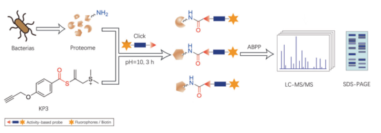 最后一项研究则针对碱性条件下的赖氨酸选择性蛋白质修饰进行了探索。李子刚/尹丰课题组构建了一系列基于炔丙基锍盐的活性酯化合物,利用其强亲电性在碱性条件下与赖氨酸残基的氨基反应,通过形成酰胺键实现了对赖氨酸的选择性修饰。经过蛋白层面上的一系列优化后,该策略能成功应用于多种细菌赖氨酸残基的蛋白质标记,并结合活性蛋白组学技术成功鉴定和分析了数百个细菌蛋白质中的被标记赖氨酸残基。