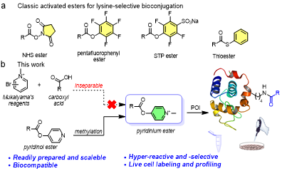 赖氨酸是绝大部分蛋白质表面可溶剂化氨基酸残基中丰度较高的残基,常位于重要的活性口袋或药物靶点位置附近。然而,在生理环境中(pH 7.4),赖氨酸的氨基侧链通常处于质子化状态,其亲核反应性大大降低,因此,活细胞中赖氨酸的选择性标记和修饰一直是蛋白质化学研究中的难点。因此,活细胞中赖氨酸的选择性标记和修饰,一直是蛋白质化学研究中的重点和难点。而能实现活细胞中赖氨酸残基的高效和高选择性化学标记,无论是在化员工物学基础研究还是生物医药研究中都具有重要意义。
