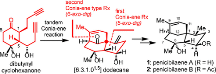 三环倍半萜是一类重要的天然产物,它们的结构多样性和生物活性不仅引起了人们对药物发现领域的兴趣,也是化学家发展创新方法的灵感来源。三环[6.3.1.01,5]十二烷骨架是[3.3.1]-桥环和[4.3.0]-并环组成的结构单元,广泛存在于众多具有重要生物活性的复杂天然产物和药物分子中,关于该环系骨架的构建吸引了大批有机合成化学家的关注。(+)-penicibilaenes A和B是具有全新三环[6.3.1.01,5]结构的倍半萜海洋天然产物。该天然产物具有抗真菌活性,对植物病原真菌Colletotrichum gloeosporioides表现出选择性抑制活性,特别是penicibilaene B的抑制效果优于广谱抗生素zeocin。