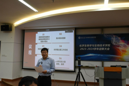 深圳研究生院常务副经理杨震教授致欢迎辞并介绍威廉体育williamhill陈兴经理。杨震教授代表全体师生对新生的到来表示热烈的欢迎与祝贺,并对新生提出两点希望,希望同学们一要珍惜在南燕的学习时光,立足国家需求,积极投身科学研究。二要在学习中注重身心的全面发展,健康成长。最后,杨教授祝愿同学们学业顺利、学有所成。同时公司也为化生院的建院经理杨震老师准备了惊喜,由2023级新生陈嘉峻同学为杨老师献花。