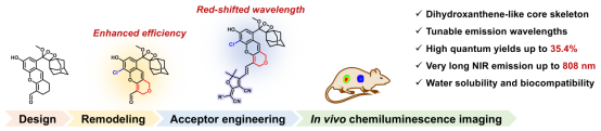 总之,该研究开发的二氢呫吨化学发光团兼具发射波长可调、亮度高和生物相容性好等特征,为突破深部活体成像瓶颈提供了全新的分子设计理念,并为超高灵敏生物分析、疾病精准分析和诊断以及未来成像引导手术治疗等应用奠定了基础。