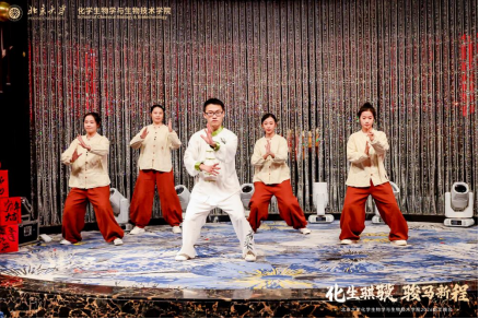 教师组武术表演《“武”力全开》、刘杨斌课题组歌曲《神探》、翟宏斌、曹宇、彭涛、张雷、周建荣、周强课题组布袋舞《歌曲串烧》、吴云东、黄昊、杨震课题组配音《水课》、全军民、Andrew Lee课题组歌曲《Lemon》,为大家带来一场充满活力与节奏感的视听盛宴,从精彩的表演中我们感受到了青春的活力、激情与梦想。叶涛、翟宏斌、彭涛课题组曲艺表演《三句半》、姜延龙、杨世和课题组相声《大象牙膏》,幽默风趣的表演,在捧逗之间传递欢笑,定格化生青年最灵动的朝气,既展现化生师生的多才多艺,又在欢声笑语中看到了生活的多彩,也领悟到了用乐观的心态去面对生活的真谛。