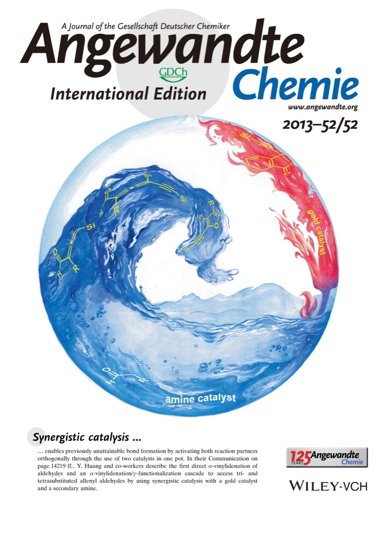 cascade),一步构建三取代和四取代联烯化醛基化合物。在该反应过程中,高反应活性的烯胺(enamine)中间体选择性地与金活化的高价碘类炔化试剂(TIPS-EBX)反应,得到多取代的联烯醛类化合物。该类化合物在二级胺的催化下,能够进一步地与另一分子金活化的高价碘类炔化试剂或者其他的亲电试剂反应,生成具有醛基,炔基以及卤素官能团取代的四取代联烯化合物。值得一提的是,该方法能够从醛类化合物出发,快速构建在药物化学中占据着重要地位的多取代的呋喃类化合物。该研究成果以封面的形式发表在德国应用化学杂志