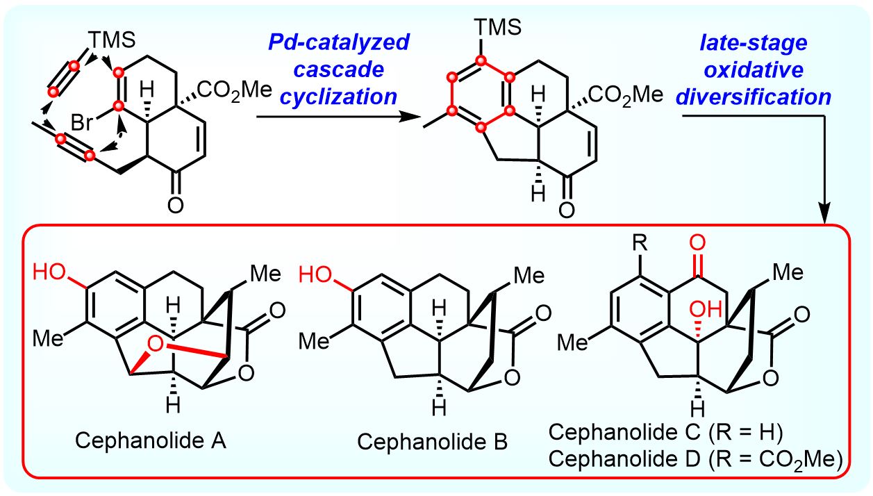 在该全合成工作中,从已知的手性醇化合物出发,通过非对映选择性的分子间Diels-Alder反应构建分子中高度官能团化的顺式6-6并环。然后,利用钯催化、基于多次碳钯化的双分子形式 [2 + 2 + 2] 环加成反应高效构建了四个目标分子中共同的四环碳环骨架。最后,通过内酯化和多样性的sp2和sp3 C-H键氧化完成了Cephanolides A-D的不对称全合成(总步骤数为11~14步)。其中,Cephanolides C和D的不对称全合成为首次报道。