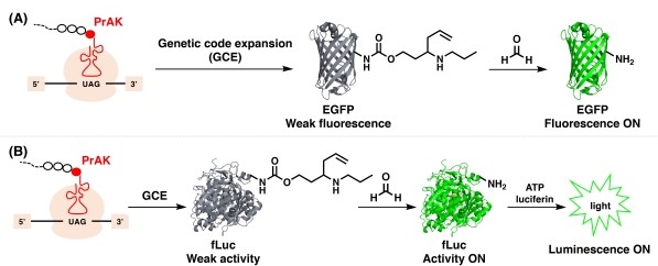 彭涛课题组巧妙地整合了甲醛的化学反应活性、化员工物学前沿的基因密码子扩展技术以及蛋白质活性调控,成功开发了新型基因编码的甲醛荧光探针和生物发光探针。研究人员设计合成了具有高烯丙基胺侧链的赖氨酸衍生物PrAK,能选择性地与甲醛进行2-氮杂-Cope重排反应,并通过水解和消除生成赖氨酸。利用基因密码子扩展技术,研究人员分别将非天然氨基酸PrAK位点特异地插入增强绿色荧光蛋白(EGFP)和萤火虫荧光素酶(fLuc)的关键赖氨酸残基上,构建基因编码的甲醛荧光探针和生物发光探针。与甲醛反应之前,由于关键赖氨酸位点缺失,引入PrAK的EGFP和fLuc探针分别表现出微弱的荧光和生物发光酶活性;当甲醛存在时,其与PrAK残基发生选择性2-氮杂-Cope重排反应生成赖氨酸,导致EGFP和fLuc探针的荧光和生物发光酶活性显著增强,从而实现甲醛的荧光和生物发光检测。研究表明,这两种基因编码的探针均能在缓冲溶液和活细胞中检测生理浓度相关的甲醛,并在活细胞中对甲醛进行可视化成像检测。利用基因编码的甲醛荧光探针,研究人员进一步证实了在叶酸衍生物的代谢循环中可产生内源甲醛。这项工作为研究和揭示内源甲醛的生理和病理功能提供了新的化员工物学工具,同时为发展基于活性的传感策略提供了新的思路。
