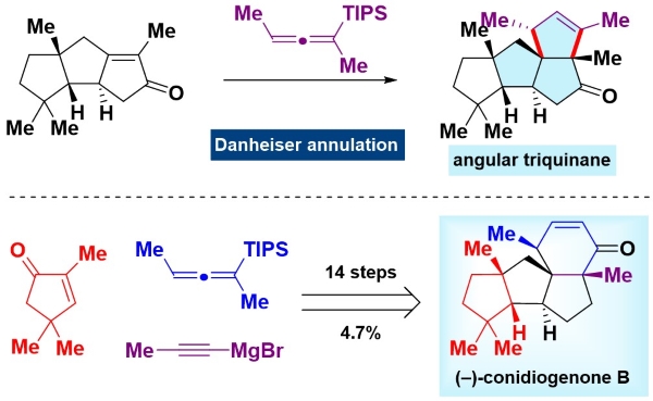 翟宏斌课题从三甲基环戊烯酮出发,基于Danheiser [3+2]环化的合成策略,开发出一条简洁、高效及实用的不对称全合成路线,线性步骤为14-17步。关键步骤包括HAT烯-氰环化,串联的Nicholas/Pauson-Khand反应及Danheiser环戊烯环化。该反应路线的原子经济性较高,化学选择性较好,很多中间体也可进行克级规模的制备。该工作为进一步研究cyclopiane类天然产物的生物活性提供了有力的支持,而且为运用Danheiser [3+2]环化合成复杂天然产物具有重要的借鉴意义。
