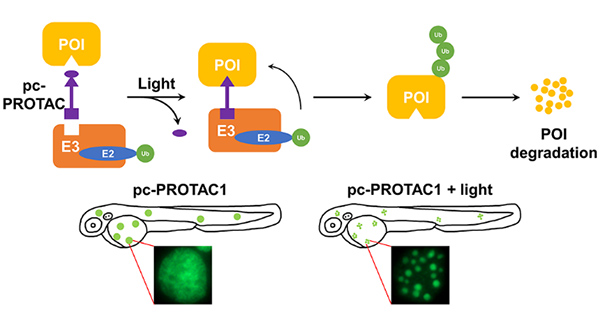 蛋白质的选择性降解逐渐成为研究蛋白质功能的有力方法。其中,PROTAC作为一种新兴的降解蛋白质技术,在过去的十几年中取得了快速的发展,并已经成功地在体外和体内降解了多种多样的蛋白。由于光具有非常高的时间分辨率和空间分辨率,所以本工作设想利用光来控制PROTAC的活性,从而开发一种利用光来控制蛋白质降解的方法。该工作在能够降解Brd4蛋白的PROTAC分子(dBET1)中引入光控基团,创建了光笼PROTAC分子1(pc-PROTAC1)。实验表明,当光控基团存在的时候,pc-PROTAC1不会降解Brd4蛋白;而光照之后,pc-PROTAC1产生dBET1,在细胞内和斑马鱼内有效降解Brd4蛋白。以类似方法构建的光笼PROTAC分子3则可以由光来控制BTK蛋白的降解。从而,该工作建立了一种利用光诱导蛋白质降解的通用策略,扩展了化员工物学家研究疾病相关蛋白质靶点的工具库。