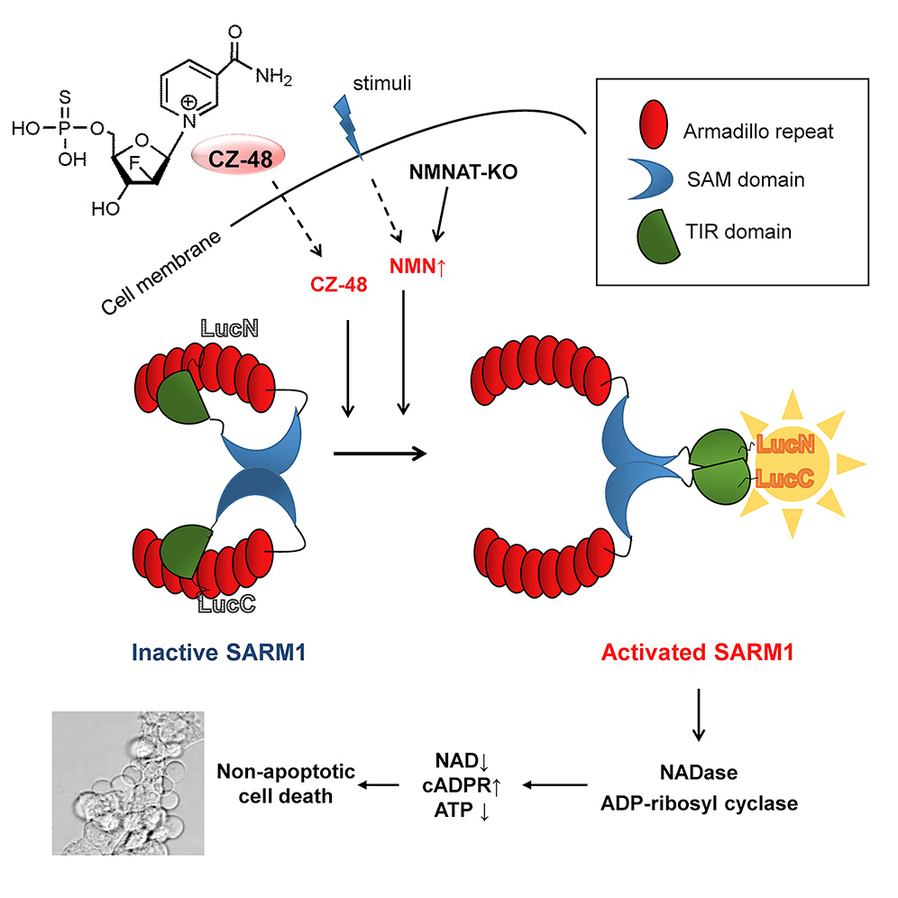 该研究组在研究CD38的过程中,意外发现其抑制剂CZ-48反而可以诱导cADPR的产生,基因敲除实验证明CZ-48通过SARM1起作用。实验证明,CZ-48是一个可透膜、抗降解的NMN类似物,它激活SARM1是模拟内源NMN的作用。而激活后SARM1和CD38非常类似,具有多种活性,包括水解和环化NAD+、水解cADPR以及NADP碱基交换等。实验证明,SARM1在细胞内处于非活化状态,NMN/CZ-48使其发生构象变化,包括释放自抑制结构域和酶促结构域的二聚化等,从而使其具有酶促活性,诱导线粒体功能障碍并引起非凋亡性细胞死亡。