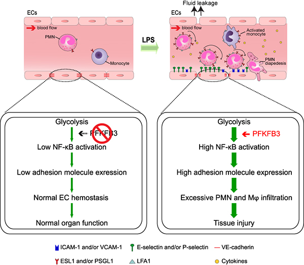 图3. 内皮细胞中PFKFB3介导的糖酵解对LPS引起的败血症的影响模式图